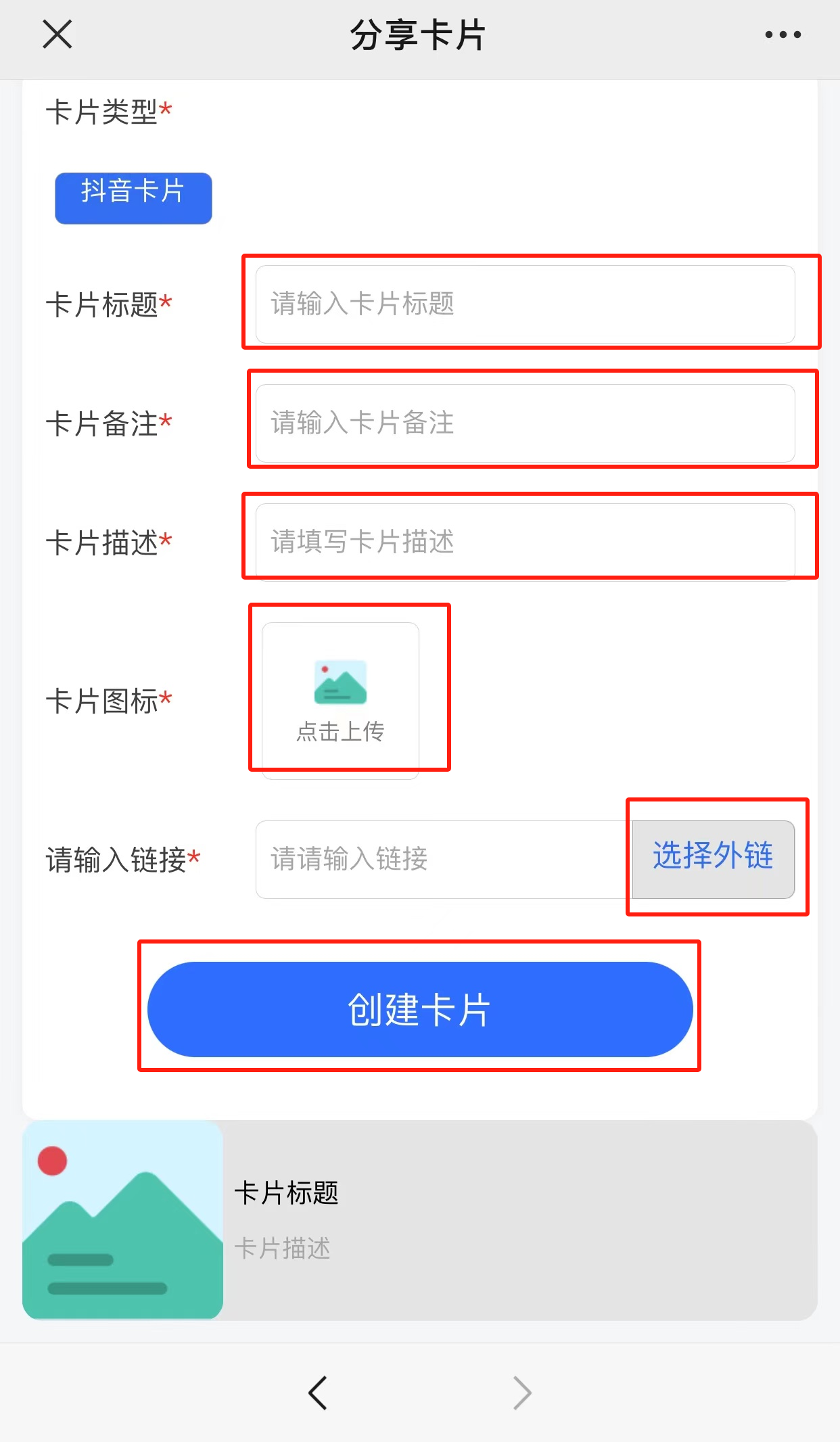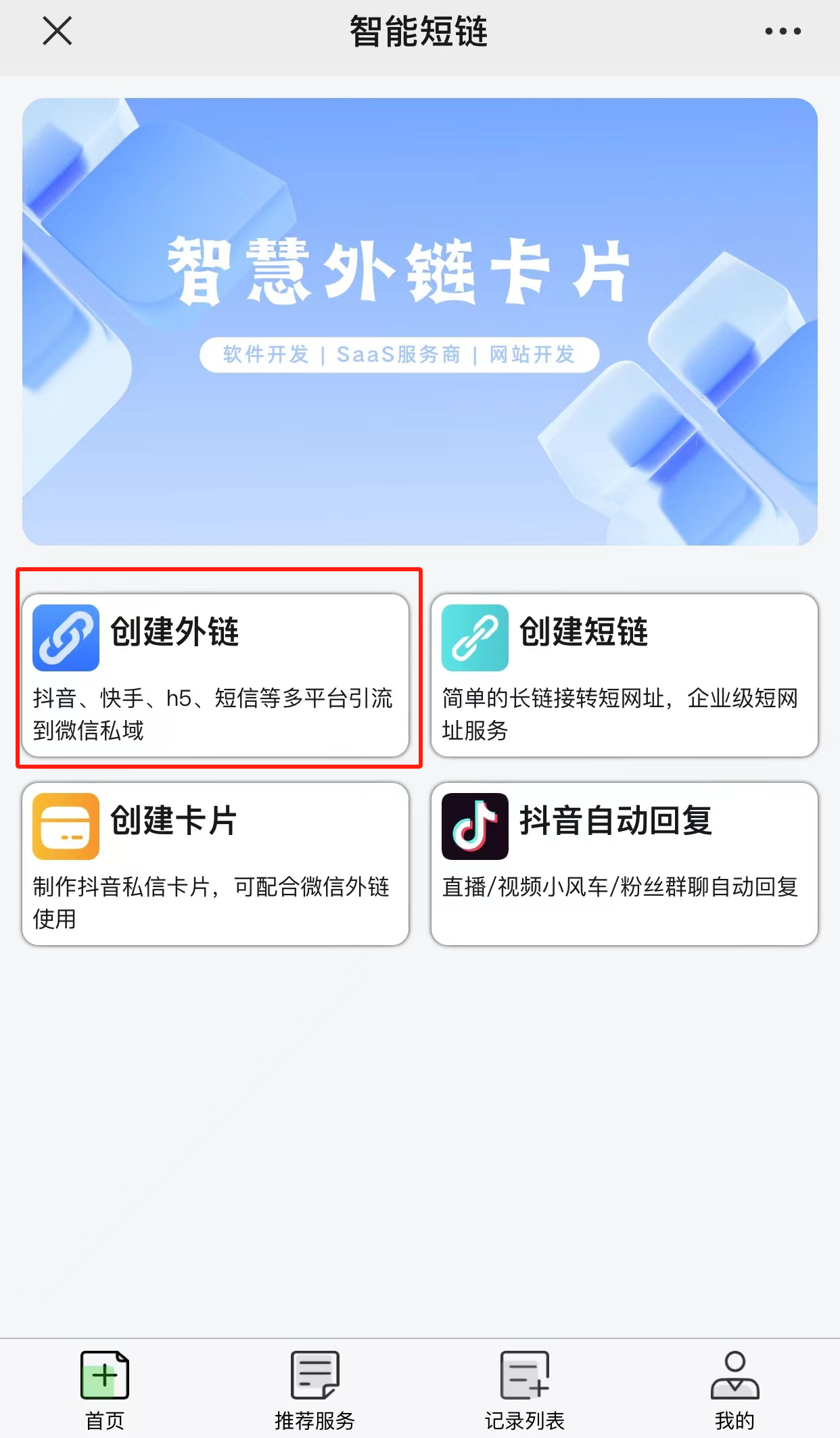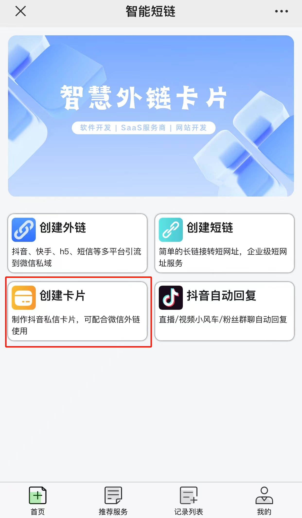### 1.登录智慧外链平台https://fws.ekkokj.com/zndl/h5/?3=#/ 点击“我的”——“请登录”——输入“手机号”“密码”——点击“立即登录” 若第一次登录平台,先注册账户,点击“我的”——“请登录”——“立即注册”——输入“手机号”“密码”——点击“立即注册” ### 2.到微信APP搜索“金山文档”小程序,点击下方“+号”  ### 3.点击“智能文档”  ### 4.输入“标题”,添加“个人二维码”,点击“完成”  ### 5.点击“分享”  ### 6.选中“所有人”“可查看”“复制链接”  ### 7.返回到“智慧外链平台”,首页——点击“创建外链”  ### 8.选中“个人微信”,依次输入“外链标题”“外链备注”——选择“公域小程序”——粘贴“金山文档的链接”——点击下方“创建外链”  ### 9.返回首页,点击“创建卡片”  ### 10.依次输入“卡片标题”“卡片备注”“卡片描述”,上传“卡片图标”,点击“选择外链”,选中刚才创建的“外链”,点击下方“创建卡片”  ### 11.点击“记录列表”——点击刚才创建的“抖音卡片”  ### 12.复制“无风险链接”  ### 13.到苹果手机抖音APP,随意一个聊天对话中,粘贴“无风险链接”,发送  ### 14.此时卡片的简介处会是长连接,然后点击“卡片”,点击“分享按钮”,分享到任一好友,即可看到完整卡片,到此抖音私信卡片创建完成。