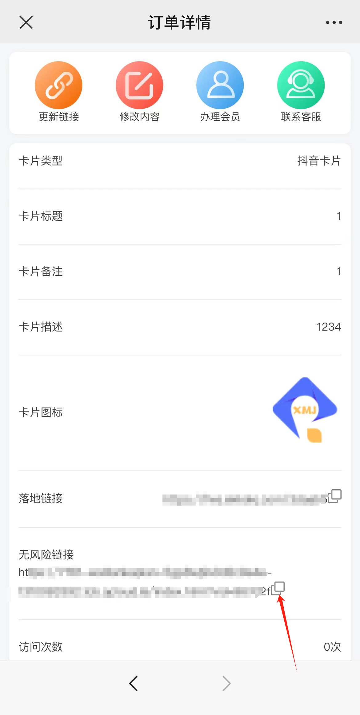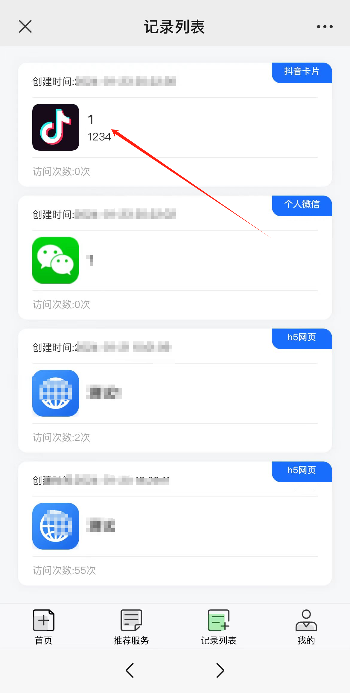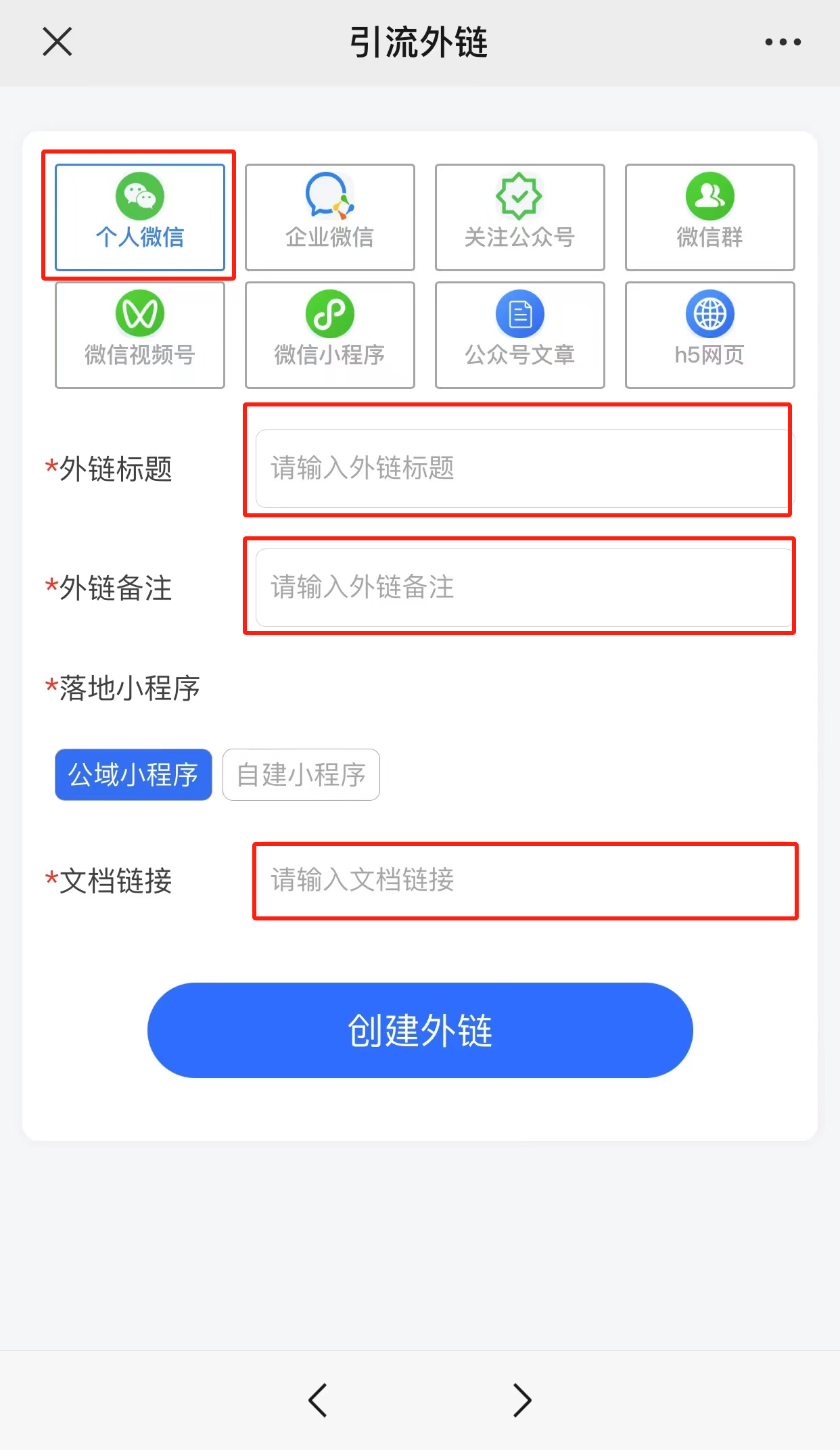 ### 1.登录智慧外链平台https://fws.ekkokj.com/zndl/h5/?3=#/ 点击“我的”——“请登录”——输入“手机号”“密码”——点击“立即登录” 若第一次登录平台,先注册账户,点击“我的”——“请登录”——“立即注册”——输入“手机号”“密码”——点击“立即注册” ### 2.到微信APP搜索“金山文档”小程序,点击下方“+号”  ### 3.点击“智能文档”  ### 4.输入“标题”,添加“个人二维码”,点击“完成”  ### 5.点击“分享”  ### 6.选中“所有人”“可查看”“复制链接”  ### 7.返回到“智慧外链平台”,首页——点击“创建外链”  ### 8.选中“个人微信”,依次输入“外链标题”“外链备注”——选择“公域小程序”——粘贴“金山文档的链接”——点击下方“创建外链”  ### 9.返回首页,点击“创建卡片”  ### 10.依次输入“卡片标题”“卡片备注”“卡片描述”,上传“卡片图标”,点击“选择外链”,选中刚才创建的“外链”,点击下方“创建卡片”  ### 11.点击“记录列表”——点击刚才创建的“抖音卡片”  ### 12.复制“无风险链接”  ### 13.到苹果手机抖音APP,随意一个聊天对话中,粘贴“无风险链接”,发送  ### 14.此时卡片的简介处会是长连接,然后点击“卡片”,点击“分享按钮”,分享到任一好友,即可看到完整卡片,到此抖音私信卡片创建完成。